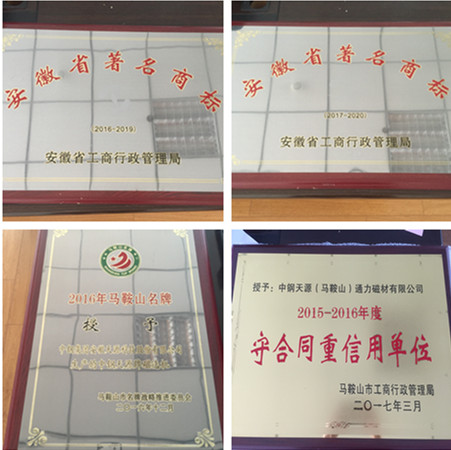 近日,中鋼天源被授予“安徽省著名商標(biāo)(2016-2019)、”、“安徽省著名商標(biāo)(2017-2020)”、“2016年馬鞍山市名牌產(chǎn)品”等榮譽稱號,同時通力公司被評為“重合同守信用單位(2015-2016年度)”。